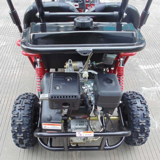 Es un asiento doble, suspensión completa kart equipadornCon 163cc, motor de 5.5hp arranque eléctrico con arranque de arranque de nuevo y característicasrn2 ruedas motrices y embrague centrífugo, simple en control con stop / go pedales. La transmisión es un fácil de usar totalmente automático con marcha atrásrnCon arnés de seguridad de 5 puntos.
